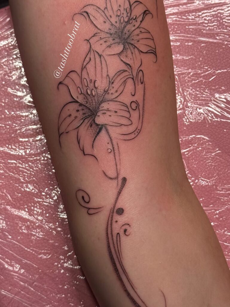 This expressive lily tattoo uses flowing linework and dot shading to create movement and texture. The elongated petals and swirling accents give the design an artistic, almost illustrative quality.