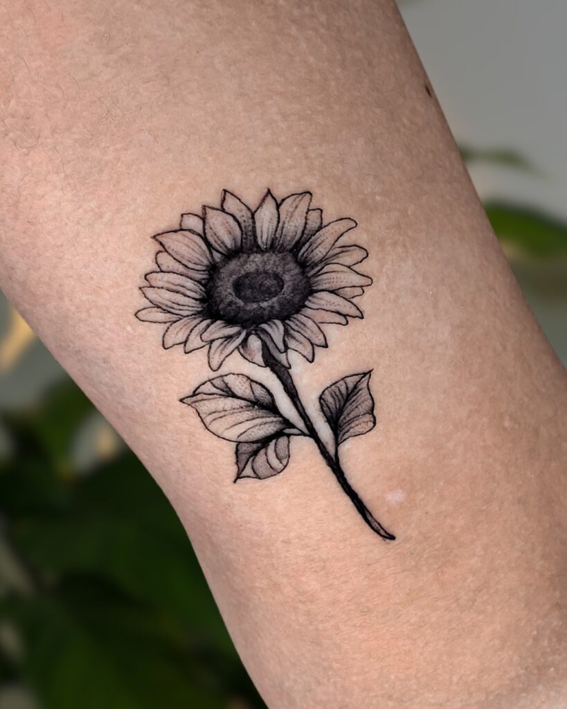 This RIP tattoo features a sunflower rendered in soft black-and-grey shading. Sunflowers symbolize loyalty, warmth, and remembrance, often associated with honoring joyful spirits and positive memories.