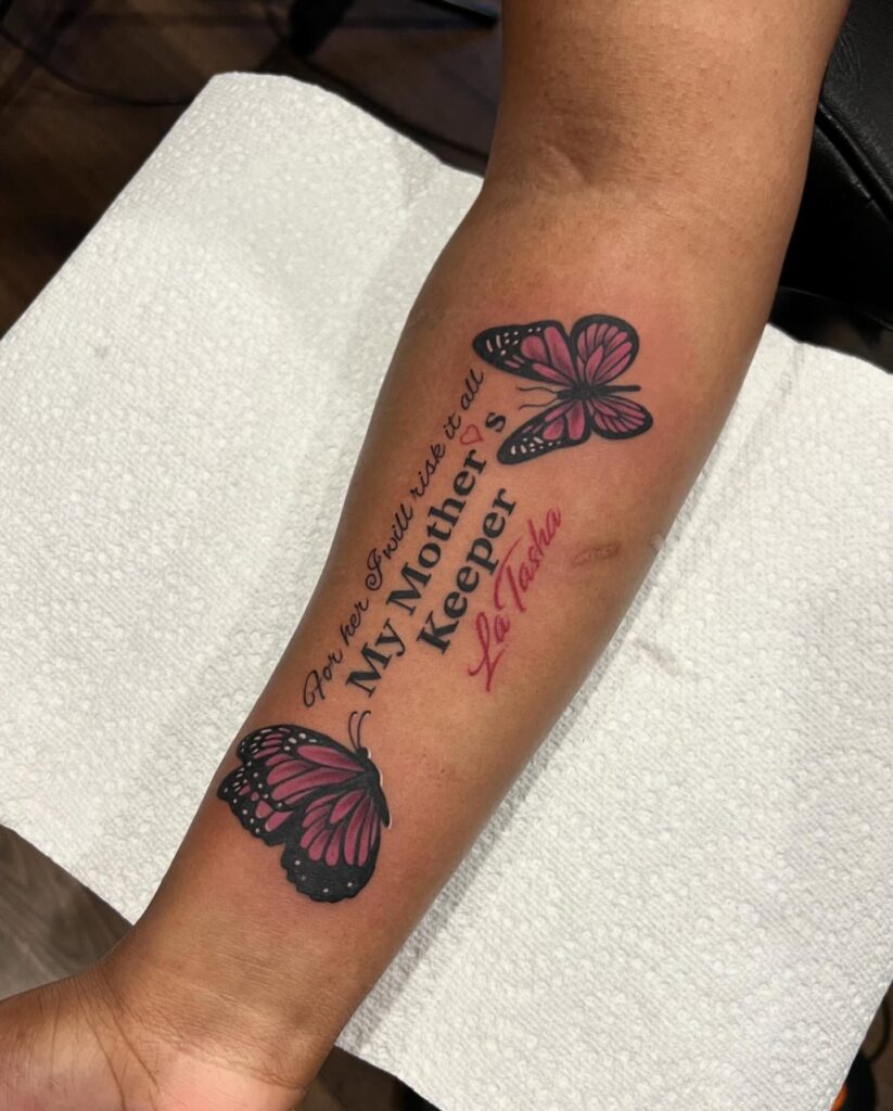 This RIP tattoo pairs butterflies with a heartfelt quote about a mother’s love living on forever. Butterflies symbolize transformation, rebirth, and the soul’s continued journey after death. The soft color palette adds warmth and emotional comfort.