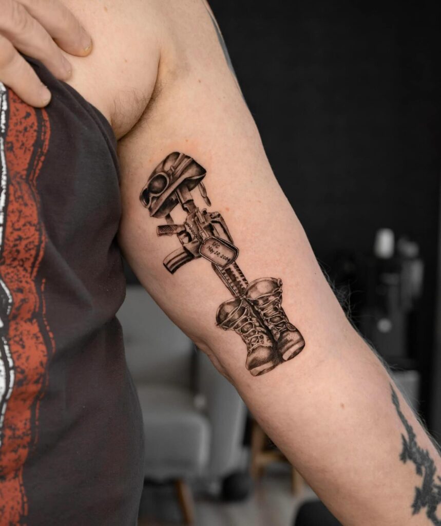 This RIP tattoo depicts military boots, a rifle, and a helmet, symbolizing sacrifice, honor, and service. The realistic shading gives the design emotional gravity, marking deep respect for a life given in duty.