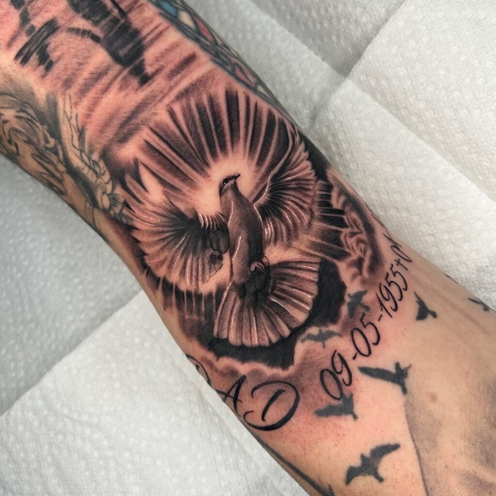 This dramatic RIP tattoo shows a dove emerging from radiant light, surrounded by clouds and dates. The upward motion represents ascension, peace, and spiritual freedom beyond physical life.