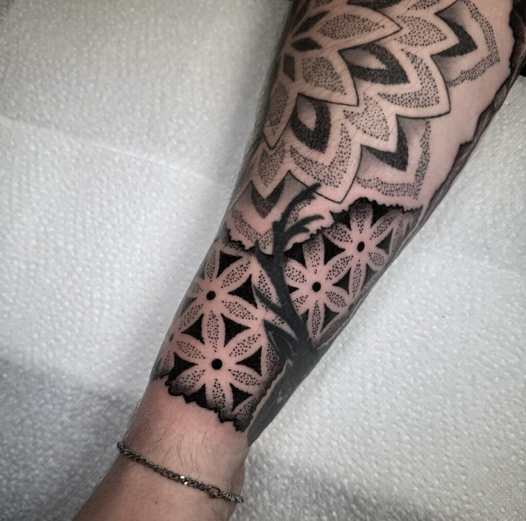 This RIP tattoo uses geometric and mandala-style patterns in bold blackwork, creating a striking visual tribute. The symmetry and repetition symbolize eternity, balance, and the never-ending cycle of life and remembrance.