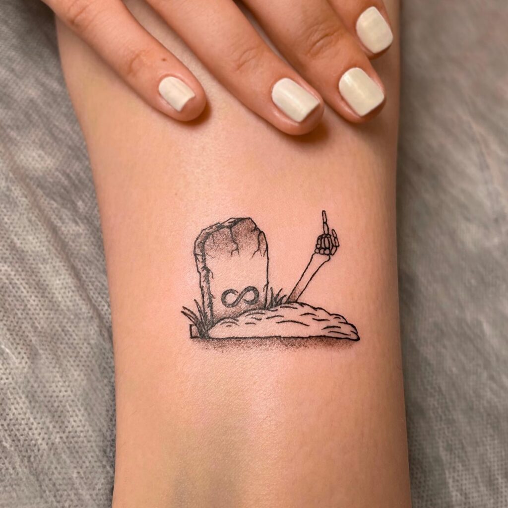 This minimalist RIP tattoo shows a grave marker with an infinity symbol and a subtle skeletal hand reaching upward. The symbolism reflects eternal love, remembrance, and the idea that bonds never truly end.