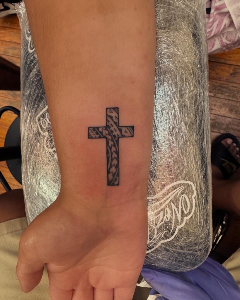 This compact cross tattoo is placed on the inner wrist, featuring clean lines and subtle detailing. Its size keeps it understated, making it suitable for everyday wear while maintaining strong symbolic meaning.