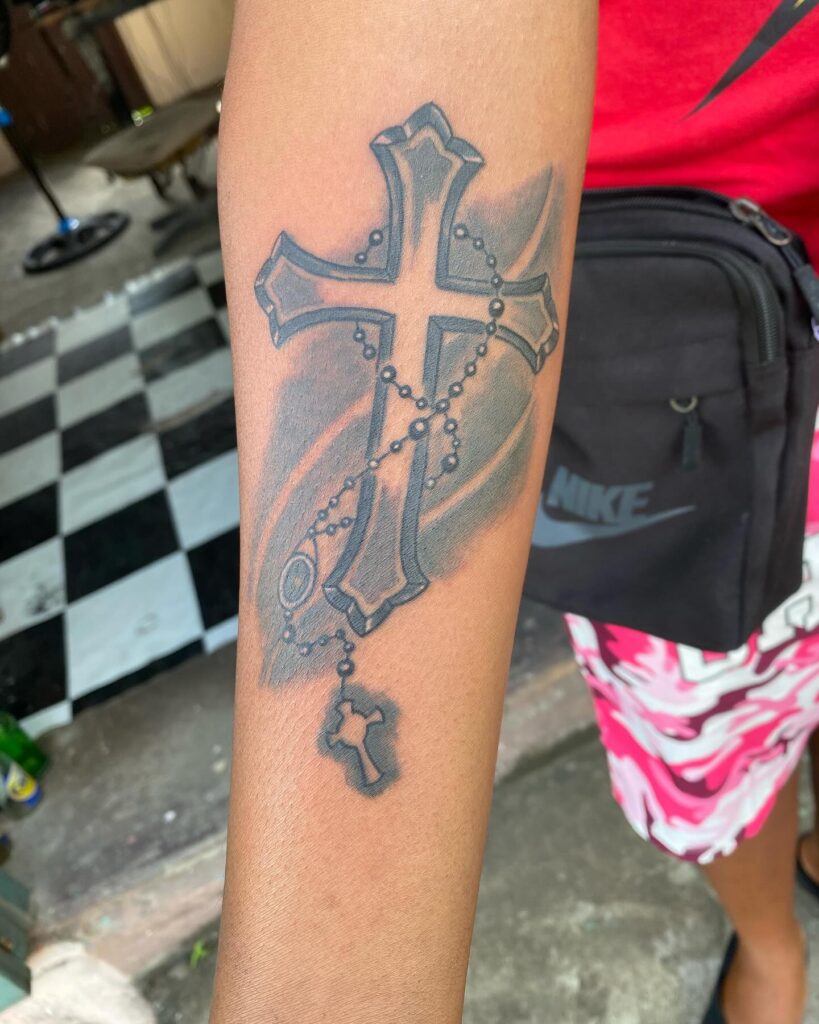 This detailed forearm tattoo combines a bold cross with a rosary chain, creating a deeply spiritual and traditional design. The soft shading adds depth, while the flowing beads guide the eye downward, enhancing the composition.