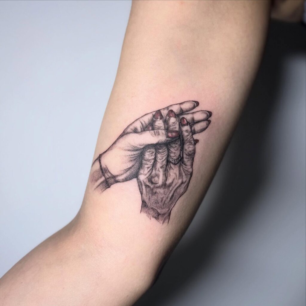 This realistic memorial tattoo depicts two hands clasped together, symbolizing comfort, protection, and love beyond loss. The fine shading adds realism, making the moment feel frozen in time.