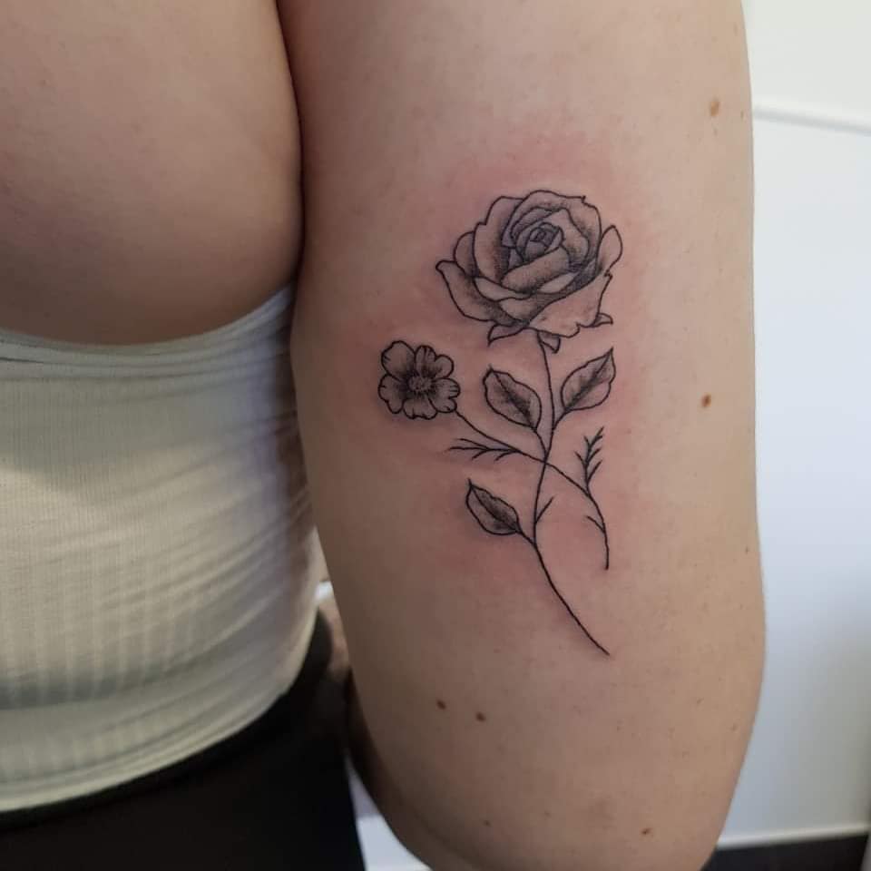 This arm tattoo showcases a delicate rose paired with a small wildflower, drawn in fine black linework with gentle shading. The composition feels airy and natural, allowing each floral element to stand out without overwhelming the skin.