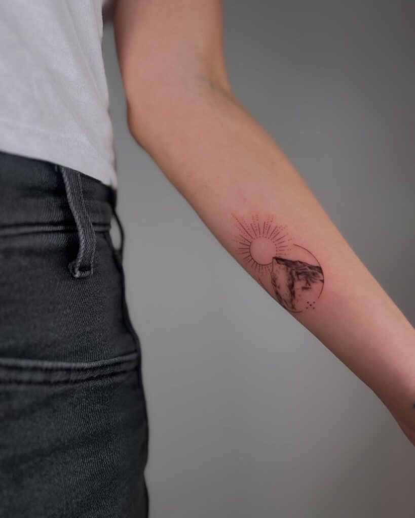 1. Sun and Mountain Fine Line Forearm Tattoo