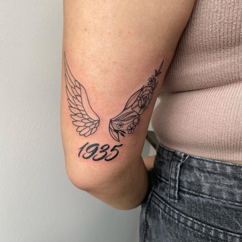 This arm tattoo combines asymmetrical angel wings—one floral, one feathered—with the bold date “1935” beneath. The contrast between organic wing details and strong numerals creates a meaningful, balanced composition.