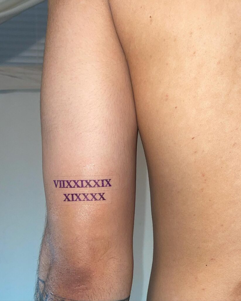 This minimalist calf tattoo features stacked Roman numerals in bold purple ink. The structured typography gives the design clarity and strength, while the placement keeps it discreet yet impactful.