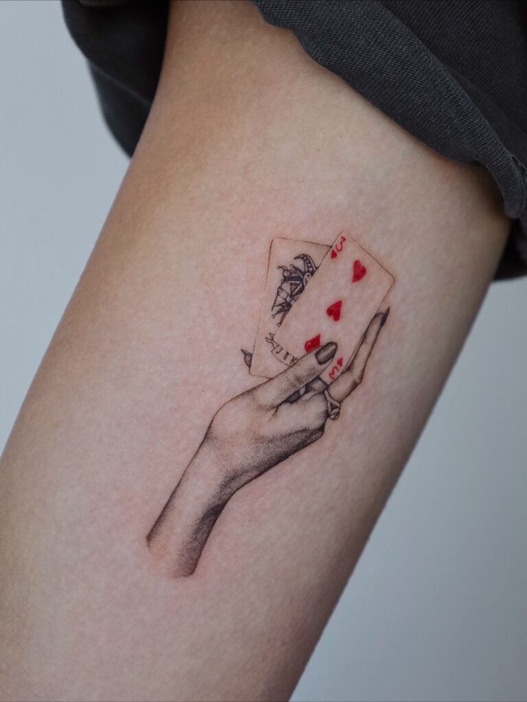 This detailed fine line tattoo depicts a graceful hand holding playing cards, accented with subtle red heart details. The realistic shading contrasts beautifully with the minimalist linework, creating a striking yet refined visual on the arm.