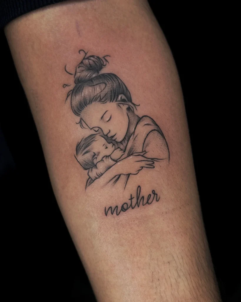 This black-and-grey realism tattoo captures a mother kissing her baby’s forehead, with gentle shading and expressive emotion. The word “mother” completes the design.