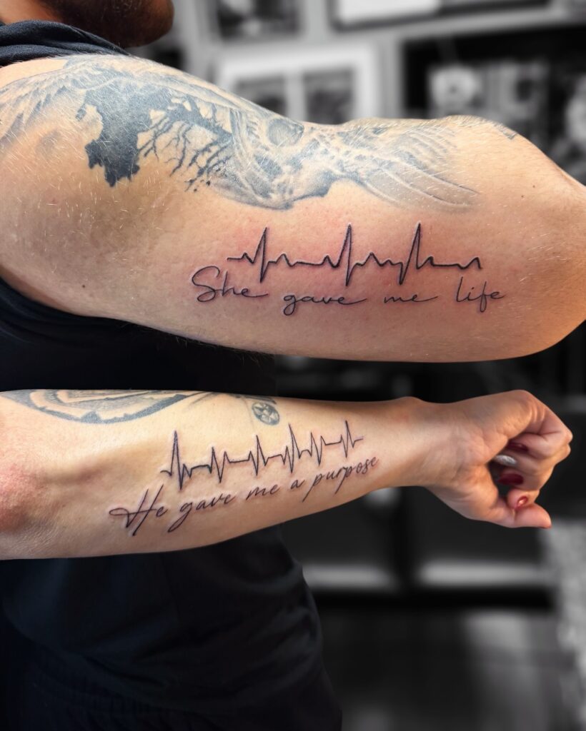 These matching arm tattoos feature an ECG heartbeat line paired with meaningful text: one reading “She gave me life,” and the other, “He gave me a purpose.”