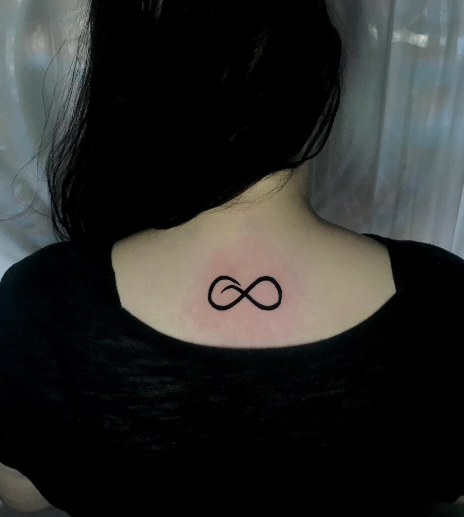 This tattoo features a solid black infinity symbol placed at the back of the neck, creating a strong yet minimalist statement. The bold linework contrasts with the softness of the placement, making it eye-catching without being overly complex. Its symmetry gives it a timeless and powerful presence.