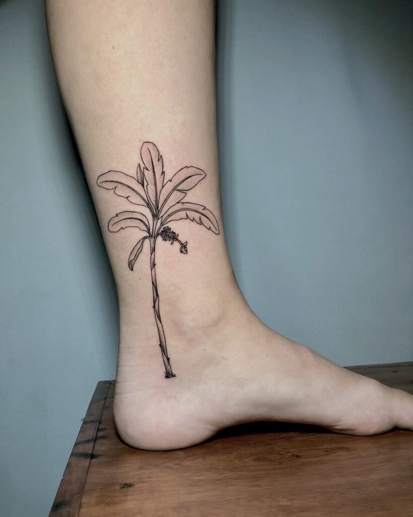 This elegant ankle tattoo features a slender palm tree drawn in fine lines, emphasizing grace and simplicity. The tall, flowing trunk naturally follows the ankle’s curve, while the leaves spread gently, creating a light and airy composition. The minimal detailing keeps the design refined and timeless.