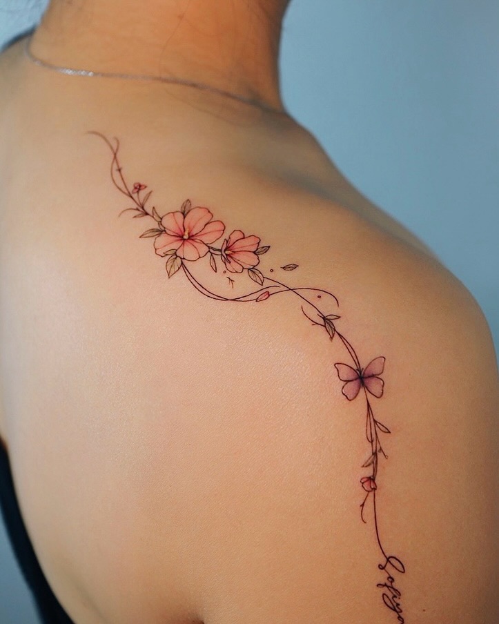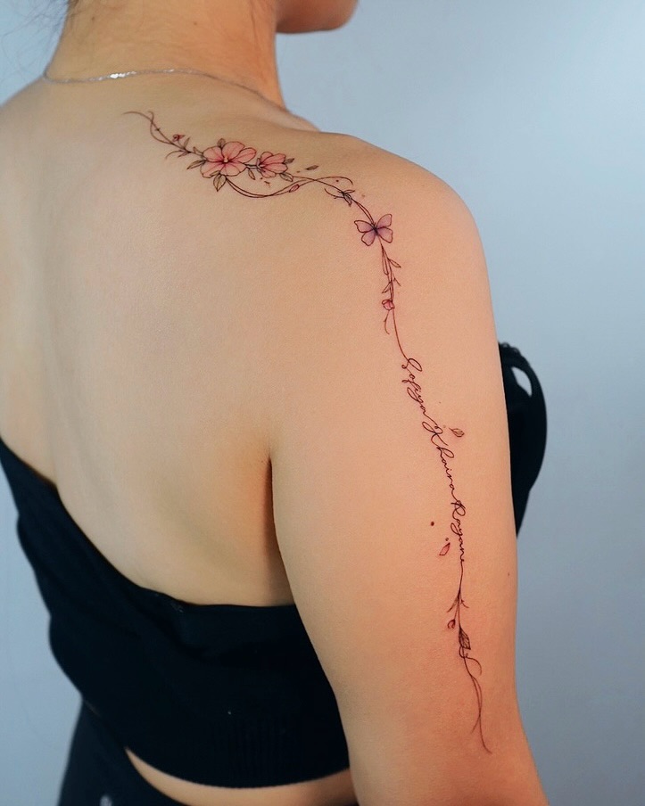 This small shoulder tattoo features a delicate floral vine flowing gracefully across the upper shoulder and collarbone area. Soft pink blossoms, fine stems, and subtle linework create a lightweight, feminine design that follows the body’s natural contours without overpowering the skin.