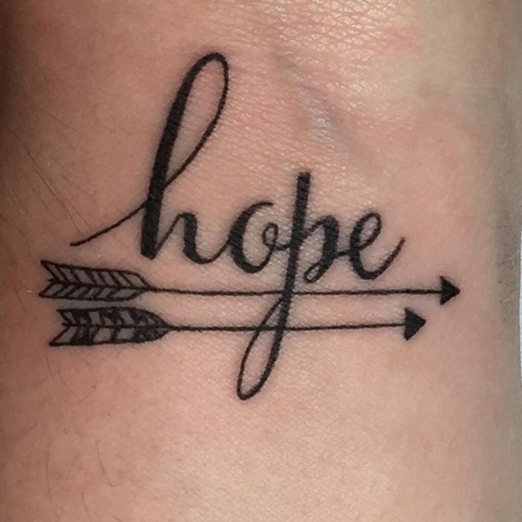 This wrist tattoo combines the word “hope” with a double-arrow motif, blending symbolism and typography into one cohesive design. The arrows suggest direction and forward movement, while the script adds softness and emotional depth. The black ink keeps it clean and bold.