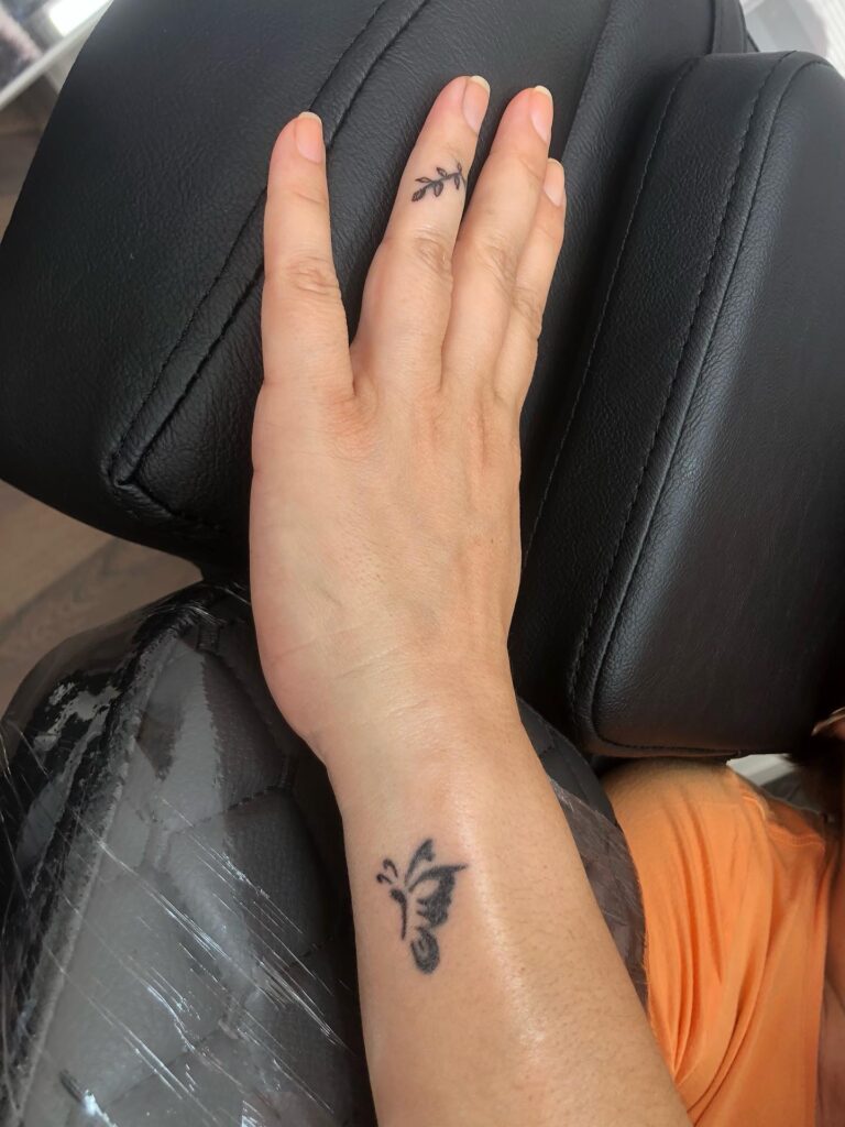 This small wrist tattoo features a simple butterfly silhouette rendered in black ink. The compact design and soft edges make it subtle, elegant, and easy to wear daily. Positioned near the wrist, it feels light and effortlessly stylish.
