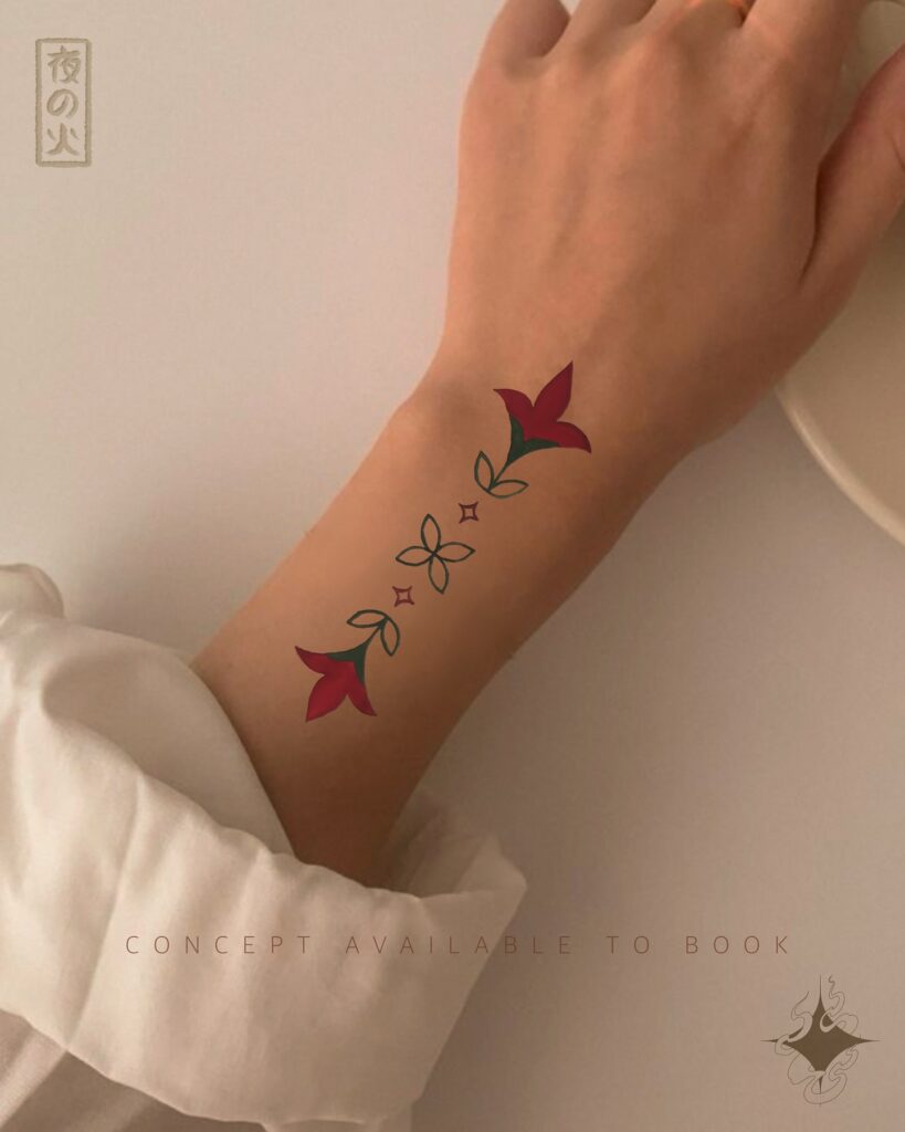 5. Delicate Floral Wrist Tattoo with Red Accents