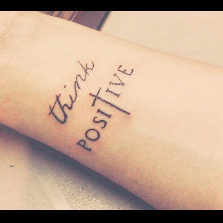 This small wrist tattoo features the phrase “think positive” in a clean, handwritten-style script. The casual lettering gives it an effortless, personal feel, while the compact size keeps the design subtle and wearable for everyday life. Placed along the inner wrist, it’s easy to glance at and quietly meaningful.