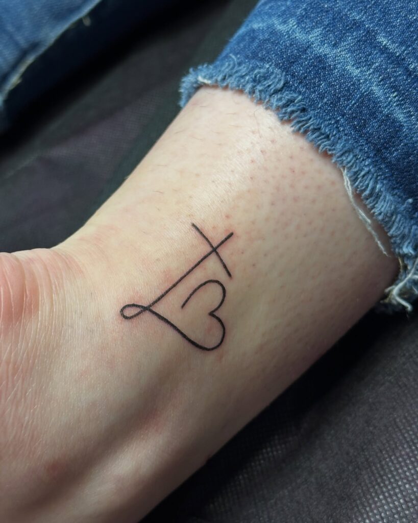 This simple ankle tattoo combines a heart and cross in a single continuous line. The minimalist execution gives it a modern, intimate feel, symbolizing love, faith, and emotional grounding.