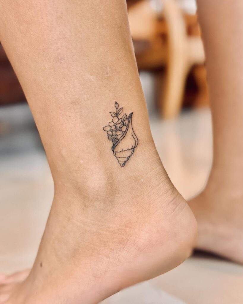 This delicate ankle tattoo blends a fine-line seashell with small florals, creating a soft coastal-inspired design. The thin outlines give it a lightweight, elegant feel, symbolizing calm, protection, and a connection to nature. Its minimal scale makes it subtle yet deeply aesthetic.