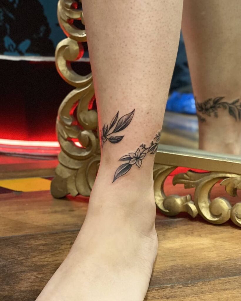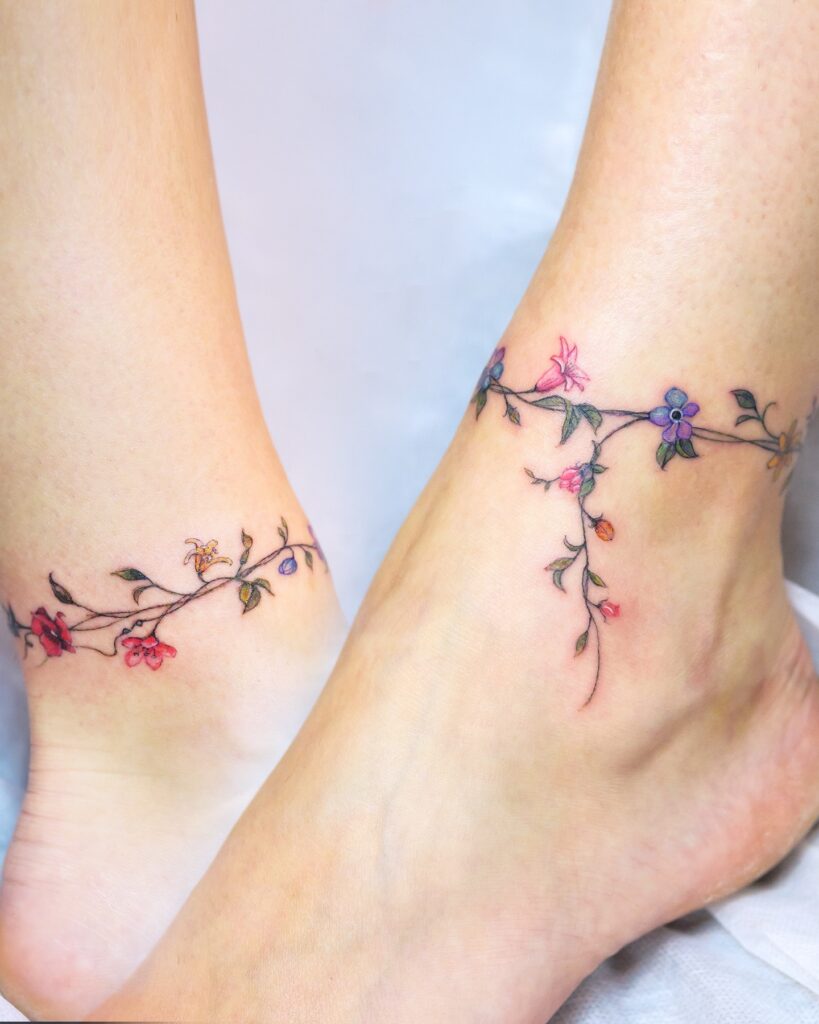 This elegant ankle tattoo features a thin floral vine wrapping gently around the ankle. Soft color accents and delicate leaves give it a natural, almost jewelry-like appearance. The design symbolizes growth, connection, and continuity.