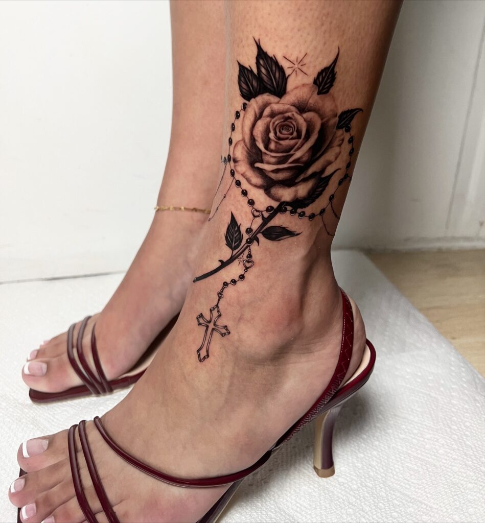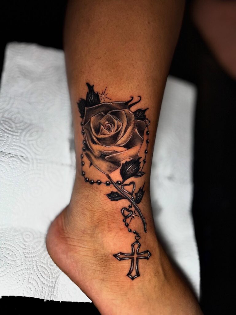 This realistic ankle tattoo combines a shaded rose with a rosary chain and cross, blending love, faith, and remembrance. The rose’s detailed petals add softness, while the rosary introduces spiritual devotion and grounding meaning.