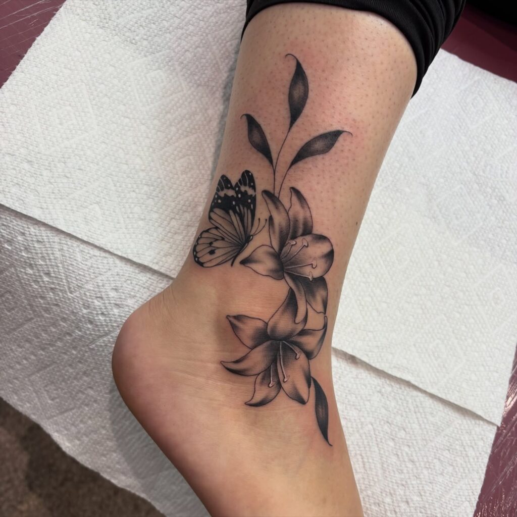 This realistic ankle tattoo showcases blooming lilies paired with a butterfly, rendered in smooth black-and-grey shading. The flowers represent purity and renewal, while the butterfly symbolizes transformation and freedom. The soft gradients give the tattoo depth and lifelike flow