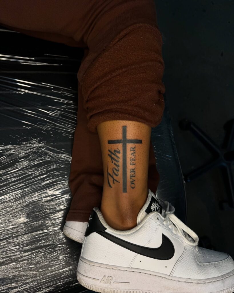 This ankle tattoo features a bold cross paired with the words “Faith Over Fear,” rendered in clean lettering. The strong contrast and vertical alignment emphasize resilience, belief, and inner strength.