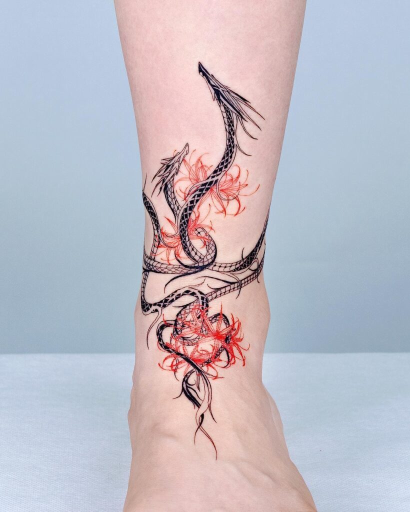 This striking ankle tattoo features an abstract dragon entwined with flowing red floral elements. The sharp black lines contrast with expressive red accents, symbolizing strength, protection, and transformation.