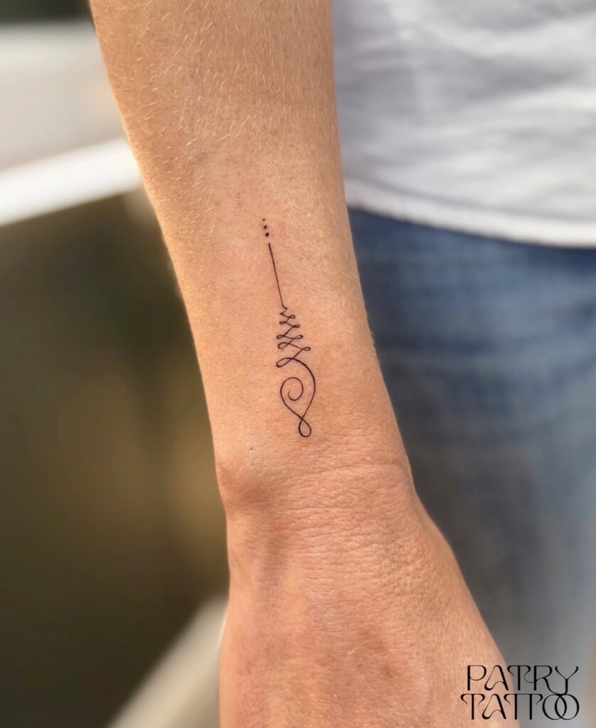 Placed along the wrist, it follows the natural contours of the arm, enhancing its graceful appearance. Abstract symbols like this often represent personal journeys or inner growth. This tattoo is ideal for someone who prefers meaning that’s personal and open to interpretation rather than overt symbolism.