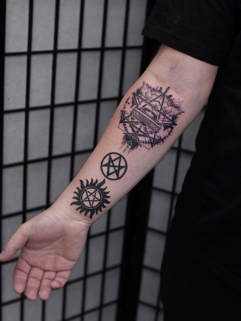 This forearm tattoo combines multiple occult-inspired symbols into a cohesive, layered composition. A bold pentagram sits prominently alongside a sun-like emblem, while an abstract, sketch-style design above adds depth and visual tension. The black ink work is strong and graphic, yet controlled enough to keep the overall look balanced rather than overwhelming.