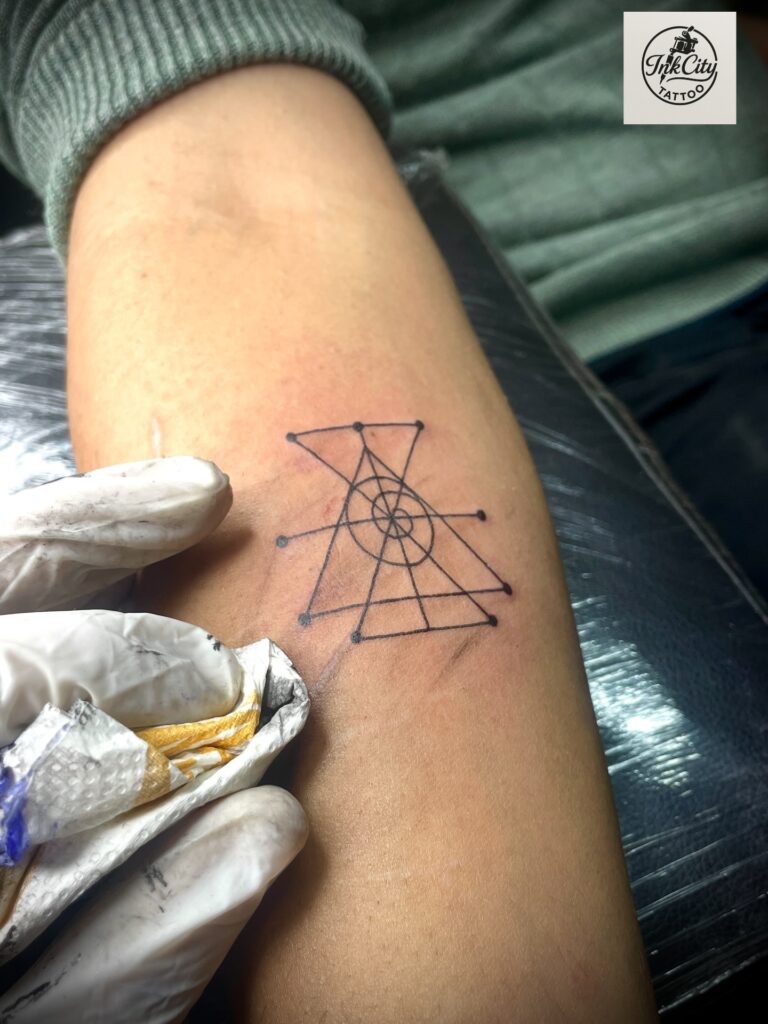 Sacred geometry tattoos are often linked to universal order and interconnectedness. The understated size keeps the design wearable while still meaningful. This piece is perfect for those who appreciate structure, symbolism, and minimalism blended into a thoughtful, modern tattoo.