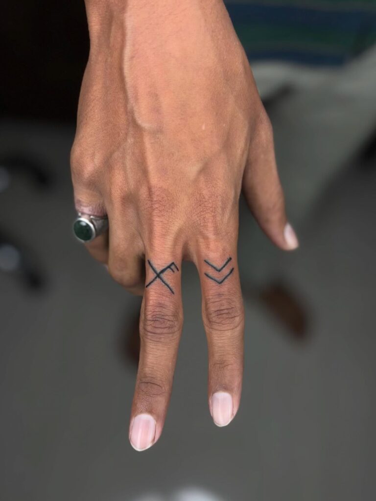 These small rune-inspired symbols are tattooed on the fingers, using thin black lines for a clean, modern finish. Their placement is bold yet restrained, offering a graphic look that feels intentional without being overpowering.