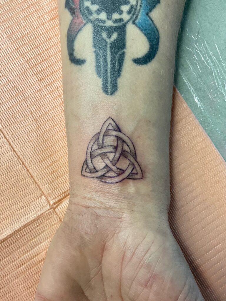This tattoo features a clean and precise trinity knot placed delicately on the inner wrist. The fine-line execution keeps the design light while preserving the knot’s interwoven complexity. Its compact size makes it subtle, refined, and ideal for a meaningful yet understated symbol tattoo.