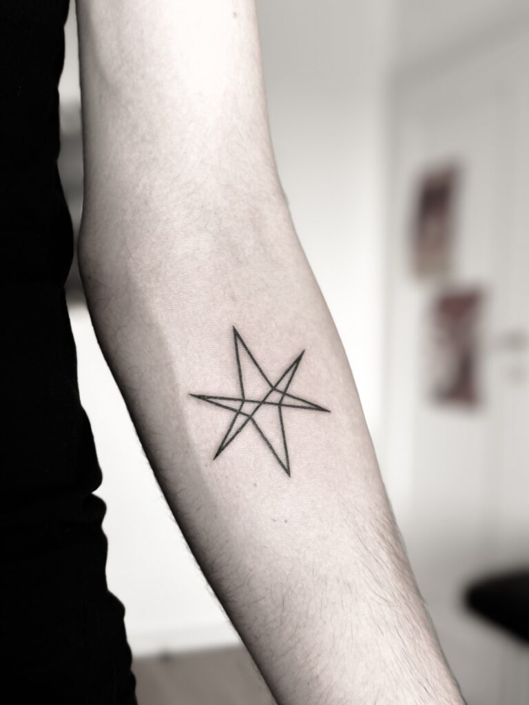 This tattoo features a simple star created with intersecting fine lines, giving it a light, almost hand-drawn feel. The minimal execution keeps it elegant and timeless.