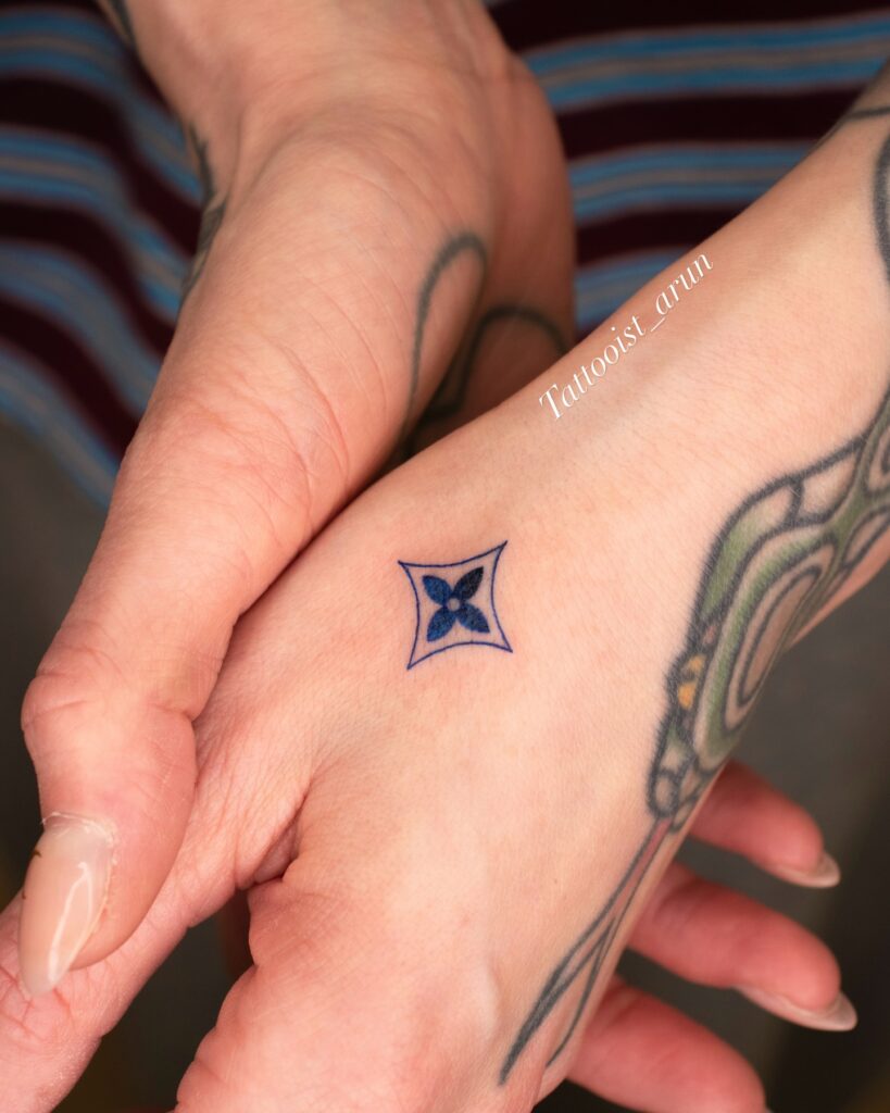 This small geometric symbol sits neatly on the hand, framed with crisp lines and a balanced shape. The simplicity of the design makes it visually striking despite its minimal size.
