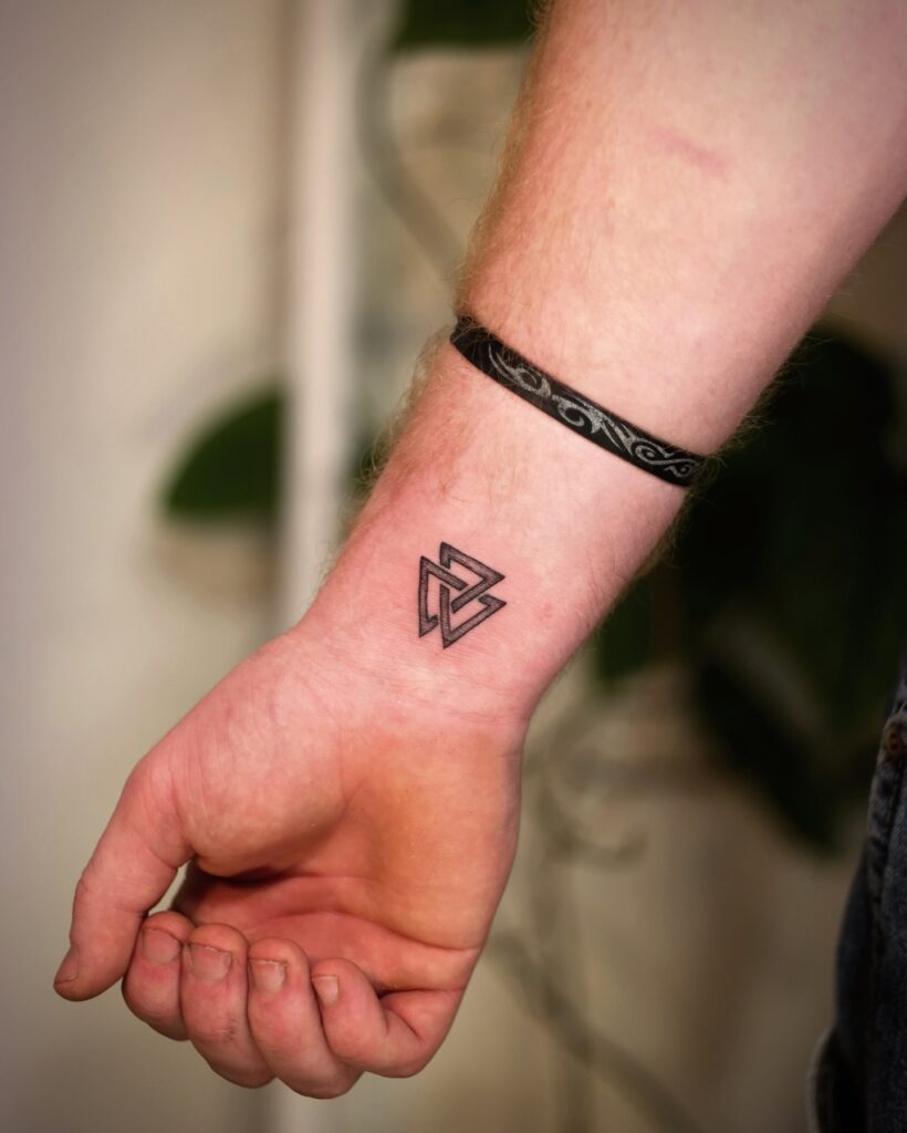 This bold yet minimal Valknut symbol is tattooed on the wrist using clean, solid lines. The geometric interlocking triangles create a strong visual impact without excessive detail.