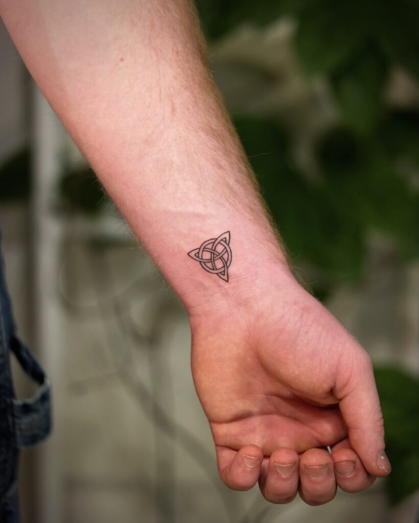 Traditionally, the trinity knot represents eternity, unity, and the connection between mind, body, and spirit. Positioned on the wrist, it becomes a personal reminder of balance and continuity. This design suits those drawn to Celtic symbolism who prefer minimal ink with deep significance.